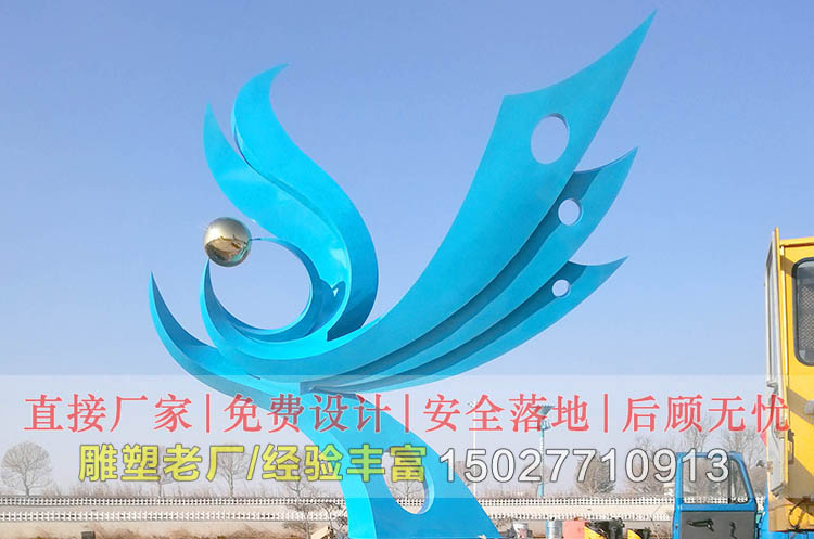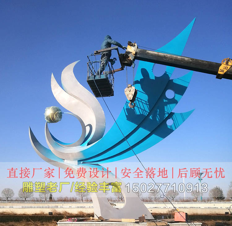 凤凰雕塑尺寸较大,我们选择分块运输,雕塑运达施工现场,进行组装拼接,整体安装完成以后,喷漆师傅在给雕塑开始喷涂防锈底漆和蓝色面漆。喷漆之前,员工会提前把雕塑表面清理干净,保证雕塑漆面的平整与稳定性。