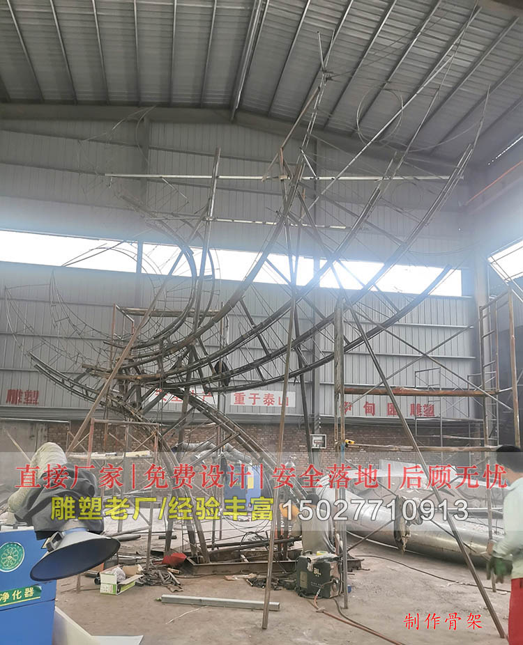 凤凰雕塑内部骨架由Φ89mm圆管和Φ12mm钢筋焊接组成,坚实稳固。雕塑骨架造型要符合雕塑的动态,所以制作骨架期间,工厂技术员和造型师会全程参与到骨架制作当中,时时对比雕塑设计图与骨架比例角度是否吻合,确保骨架自身的美感,以及凤凰雕塑优美的姿态与韵律感。