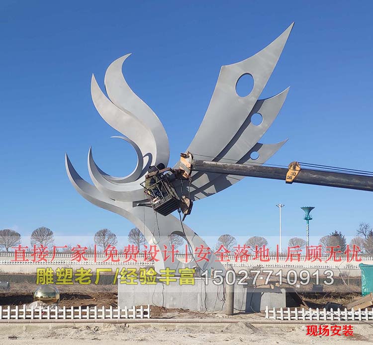 丹凤朝阳雕塑(又称凤凰不锈钢雕塑),高7.5米,长7米,不锈钢304材质制作,安装于辽宁省某城市广场。凤凰不锈钢雕塑制作流程:确认设计图→制作雕塑骨架→裁料锻造→组装焊接→打磨抛光→物流运输→现场组装→喷漆整形。