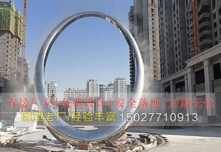 镜面不锈钢雕塑圆环喷雾雕塑,高8米,安装于陕西省某小区。镜面圆环+喷雾+喷泉流水,颇有镜中水月相映成趣的意境,水雾在空气中随风飘动,为雕塑带来动态之美。雕塑内置喷雾系统,雾气大小可调控。