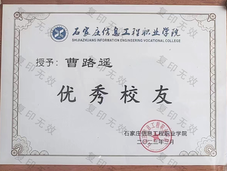 09级毕业生:曹路遥荣获“优秀校友”荣誉称号。