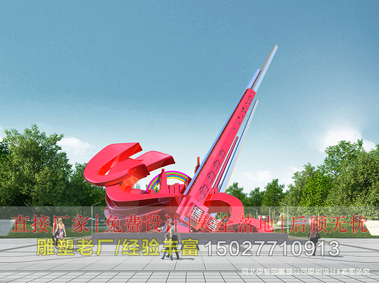 雕塑的设计元素:爱心、镐、城市剪影、红飘带15颗星星、祥云等图案。