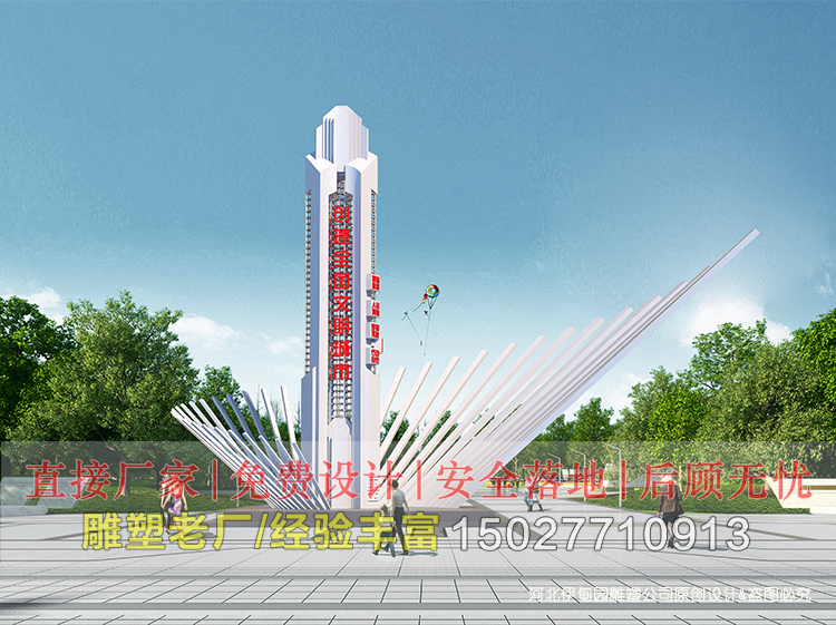雕塑设计说明:雕塑外侧呈现手掌型,托起刻有“创建全国文明城市”字体的镂空雕塑,说明城市大有包容之爱。镂空雕塑的顶端层层攀升似钻头,说明创建全国文明城市的决心。