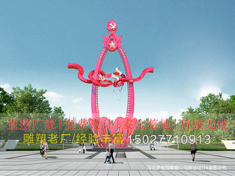 雕塑设计元素:花篮、心形红飘带、和平鸽、五星党徽、城市窗口等